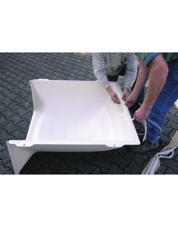 Doświetlacz okna piwnicznego (świetlik okienny, naświetle piwniczne, doświetlacz piwniczny) wykonany z kompozytu żywicy poliestrowej wzmocnionej włóknem szklanym (tzw.GFK - Glasfaserverstarkter Kunststoff, GRP, FRP lub TWS) niemieckiej marki WOLFA Bauelemente do zastosowania w obiektach podpiwniczonych i o wysokim przyziemiu, wersja wodoszczelna. Orientacja wymiarów: szerokość x wysokość x odchył od ściany z 10,0 [cm] zapasem na zasłonięcie, doświetlenie okna piwnicznego.