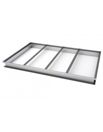 KASETON STALOWY (stalowa "futrynka") wykonany z ocynkowanej ogniowo (zgodnie z normą PN EN ISO 1461) blachy stalowej o grubości 2 [mm]. Instalujący samodzielnie wykłada np. kostką brukową dno obniżenia lub wylewa wylewką betonową / żywiczną, a w wybranym przez siebie miejscu zatapia odpływ podłączony do rury drenażowej lub instalacji burzowej. Kaseton wyposażony w wspawane co ok. 25-30 [cm], równolegle do krótszego boku T-owniki - wsporniki przeciwdziałające możliwości odkształcenia się wkładu-rusztu aluminiowego w trakcie eksploatacji. Łatwa instalacja w przygotowanym obniżeniu/ wpuście - wysokość kasetonu/ głębokość wpustu: 80 [mm]. Możliwość produkcji kasetonu na wymiar, ale przy większych wymiarach wycieraczki zaleca się jego produkcję w modułach układanych jeden obok drugiego w sekcjach. Kaseton ciężki, przez co bardzo stabilny. Bardzo duża trwałość użytkowa, odporny na chemikalia, oleje, rdzę, gorący asfalt, gnojowicę i inne czynniki agresywne. Górna krawędź kasetonu powinna licować się z powierzchnią posadzki, kostki brukowej itp.